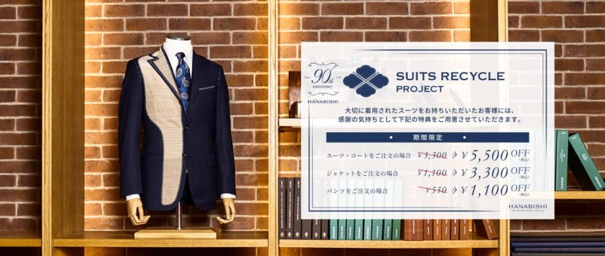 HANABISHIではスーツの下取りは年間を通じて行っていますが、なんと今なら「スーツのリサイクル割引(下取り割引)」が期間限定でさらにお得になっています。