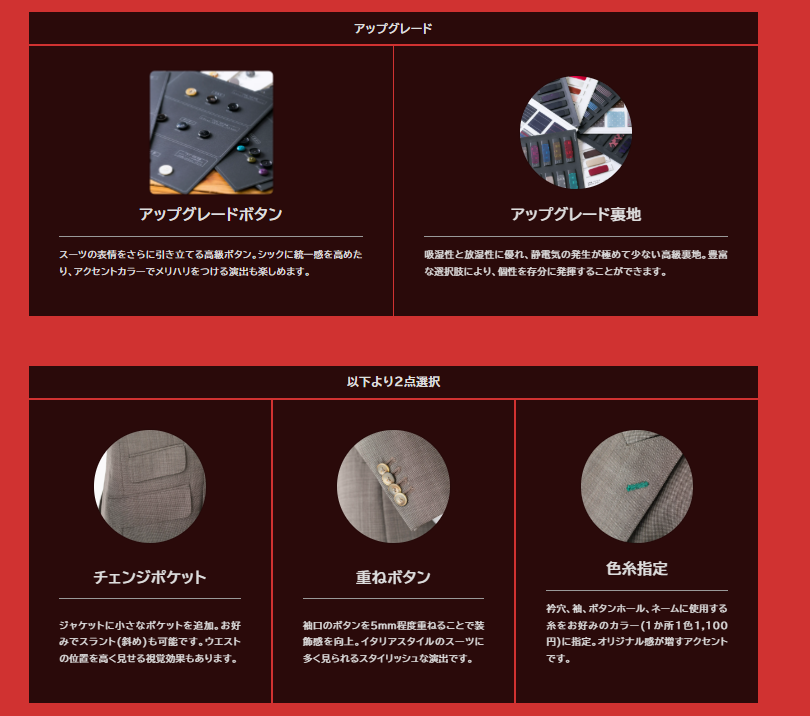 ゼニアやロロ・ピアーナといった高級生地を含む豊富な選択肢から、自分にあった一着を選ぶことができます。
