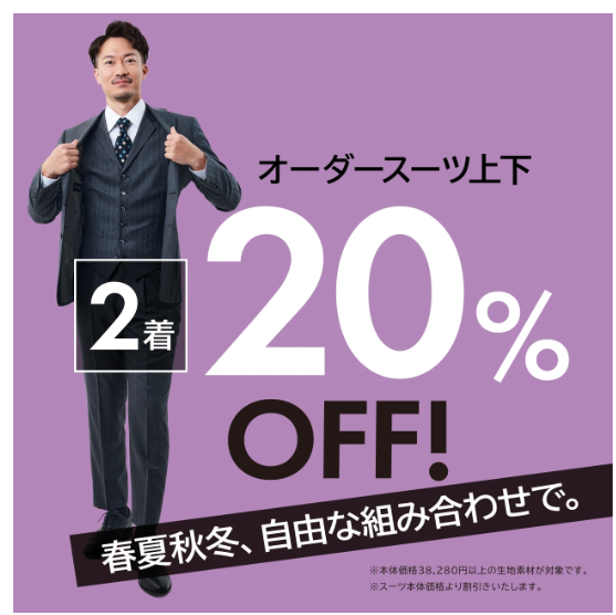 ➀オーダースーツ上下2着20%OFF!