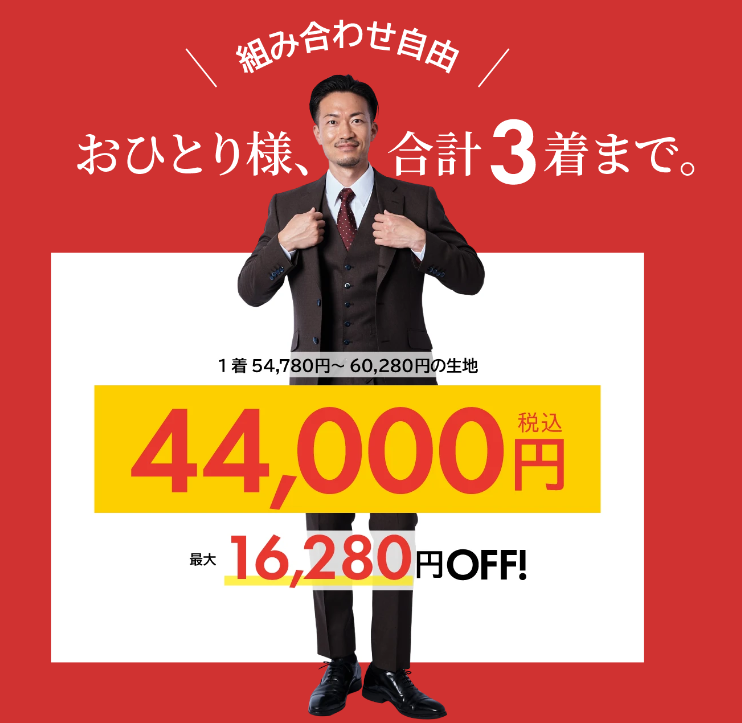 はじめての方限定でメンズ・レディース オーダースーツが19,800円(税込21,780円)~でつくることができます。