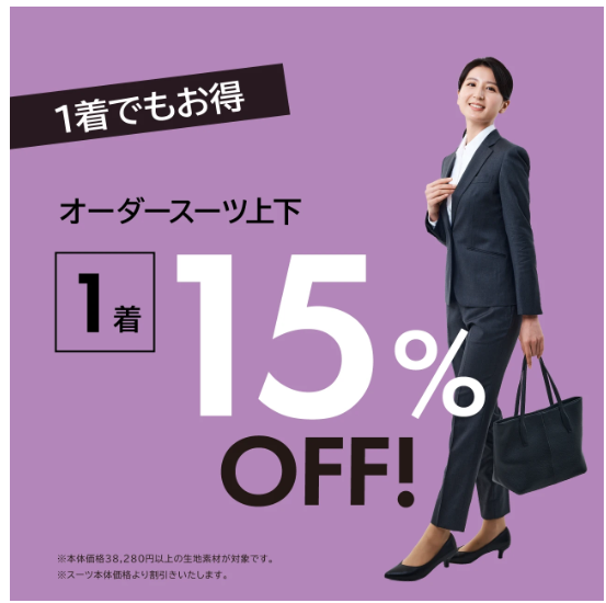 ➁オーダースーツ上下1着15%OFF!