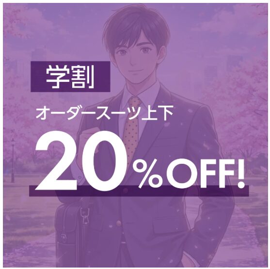 学割でオーダースーツ上下20%OFFとなります。